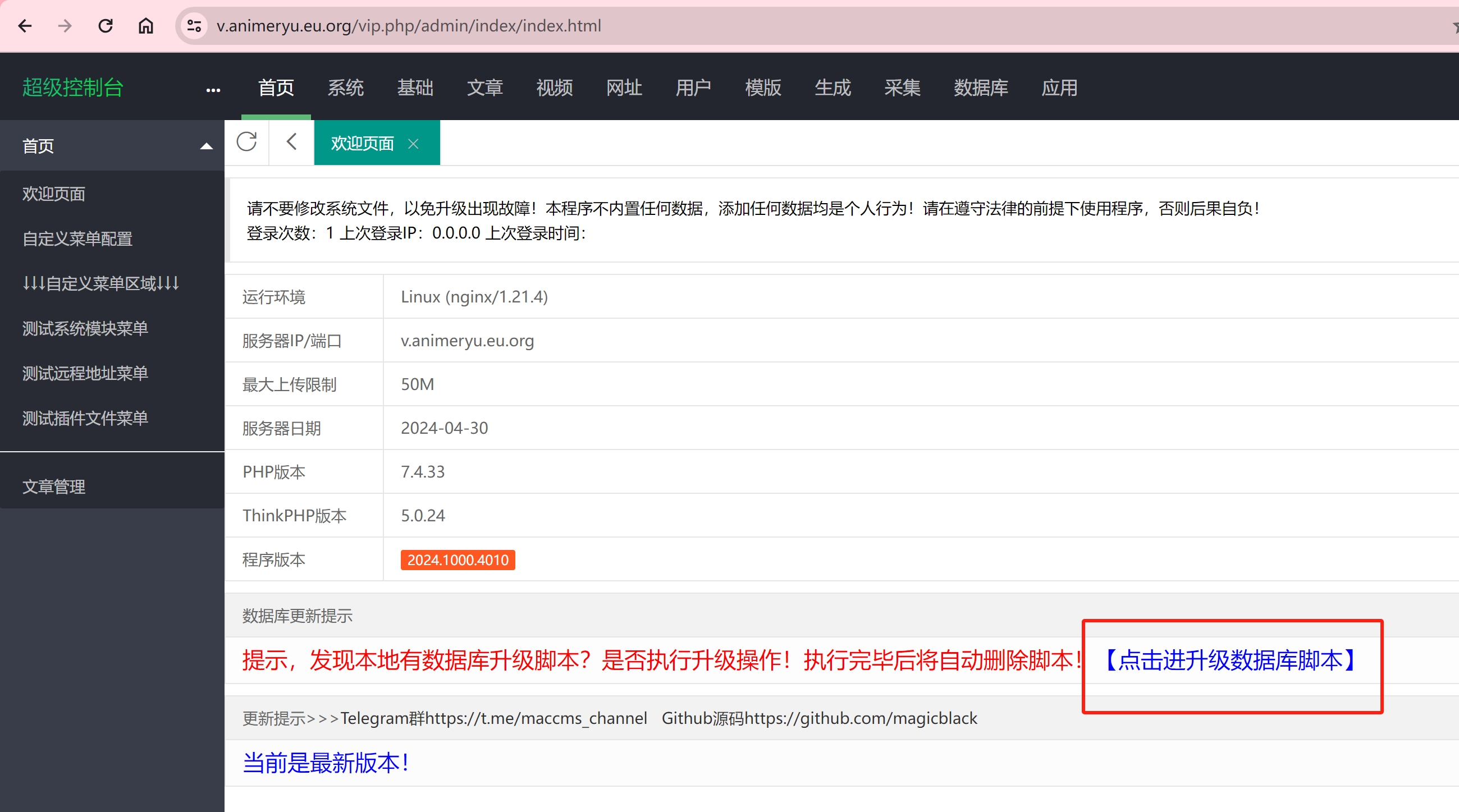 6、返回aaPanel,进入网站根目录,将admin.php更改名称,此处更改为vip.php,访问域名/vip.php,输入管理员账号、密码即可进入网站,进入后可先升级数据库脚本