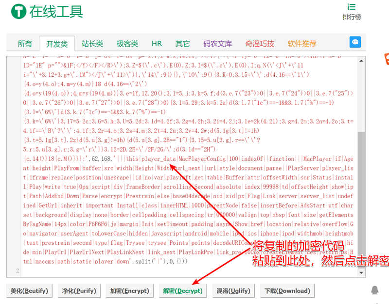 2、将加密的代码粘贴到此处,并点击解密