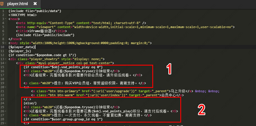 直接进入到了宝塔面板修改。找你的模板路径为/html/vod/play.html文件进行修改。截图中有2个模块,一个是非会员试看提示文字;另一个则是使用积分播放的提示文字。根据自己的需要修改对应的提示文字即可。我的主题网在此温馨提示:如果不懂代码尽量不要去修改代码部分,只修改提示文字即可。