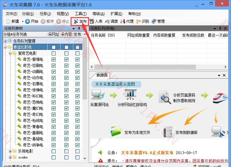 添加网站发布配置,然后双击、弹出一个弹窗,点击获取列表,稍等一会 点右边的小倒三角,采集什么分类就选择什么分类、比如我采集爱情电影,对应后台选择爱情片、选择好之后,我们点添加、点击添加之后、相对于的分类已经添加好了,点下方的保存,保存好了,转到主界面,在规则后面的三个框一定要 全部打钩 全部打钩 全部打钩 重要的事情说三遍!!全部打钩之后,我们点上方的开始后它会自动分析、分析好了之后,软件会自动采集、等采集好了,软件就开始自动发布了、软件开始发布的时候 你可以去后台看,视频是不是添加了,没有添加的话检查后台站外入库是否对齐,还有密码!