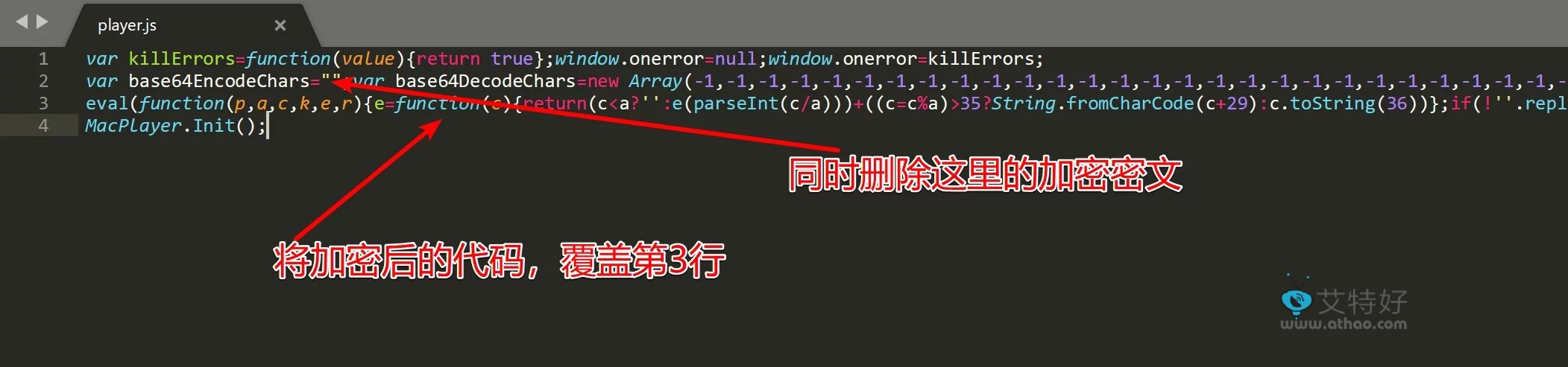 5. 将加密的代码覆盖回源player.js文件的第三行,同时需要删除第二行base64EncodeChars后面的机密密文,如下图