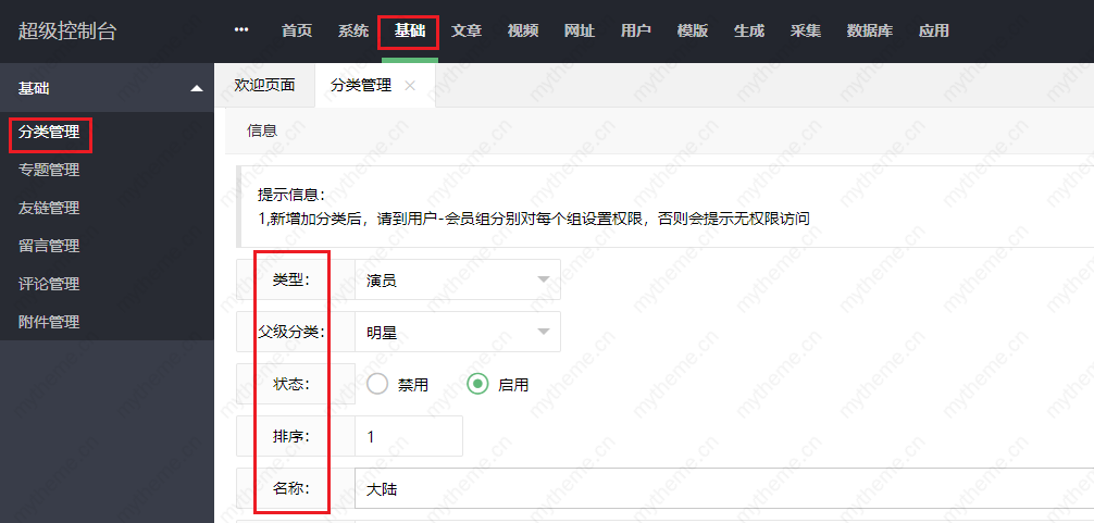 1,添加步骤和上面一样,只是填写的内容不一样,需要填写的内容根据下图红框后面的内容填写即可,填写完后记得保存。这样一个“明星”的子分类“大陆”栏目就添加成功了。