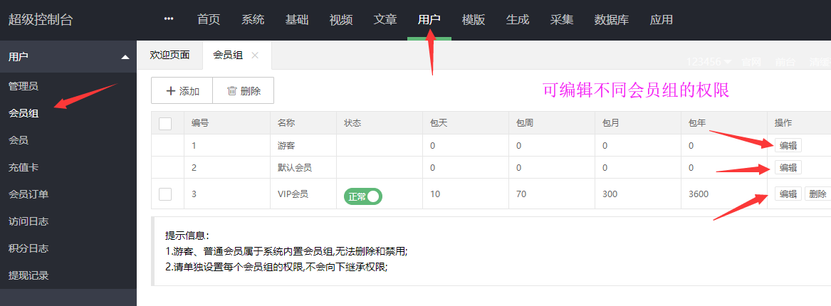 编辑会员权限,可设置升级到该会员组需要多少积分,可设置会员可浏览的页面