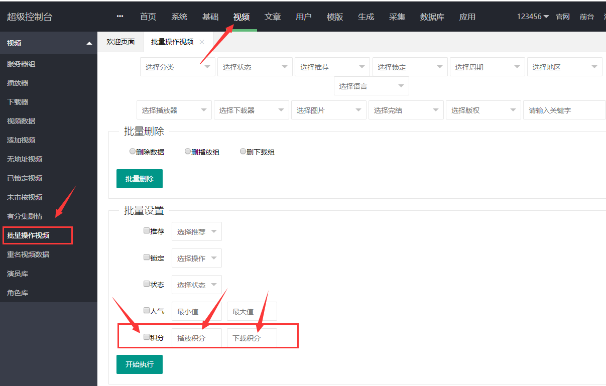 第一种步骤:视频,批量操作视频,批量设置区域,勾选积分,填写播放积分,然后开始执行,比如总共1万条数据,那么就将这1万条视频都设置同样的积分收费