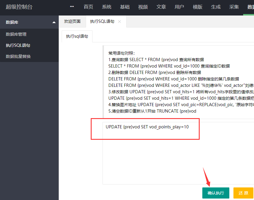 SQL语句2:UPDATE {pre}vod SET vod_points_play=10  WHERE vod_id=1000(此句的意思,视频ID为1000的视频,设置为10积分收费)