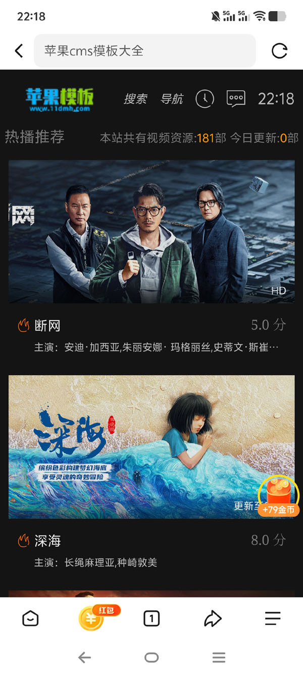 该模板是在黑色电影站\x站自适应8号模板基础上,将原本宽屏设计,改为了窄屏居中,使之更加的紧凑(新老版效果图可能不明显,实际上差别很大)。同时新增了详情页模板,可以满足影视剧集展示。