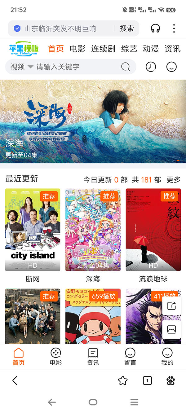 一款白色高端影视模板,值得称赞的是,该模板还专门为资讯预留了版面,以便更好提高页面原创性,页面布局合理,浏览体验比较好。